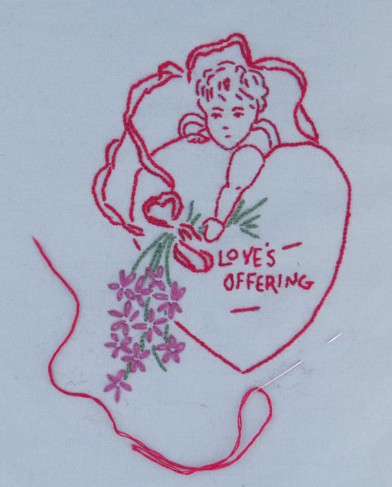 Imagined by an unknown artist, this Cupid gazes over the edge of a heart and offering a bouquet of violets to an unseen lover. The accompanying article suggests painting the image on cloth-covered cardboard as “a trifling gift” costing very little to make. The reader could then attach it to different gifts, such as shaving kits for the men in her life or a basket of food given to neighbors in need. I found that it is nicely suitable for red work embroidery.