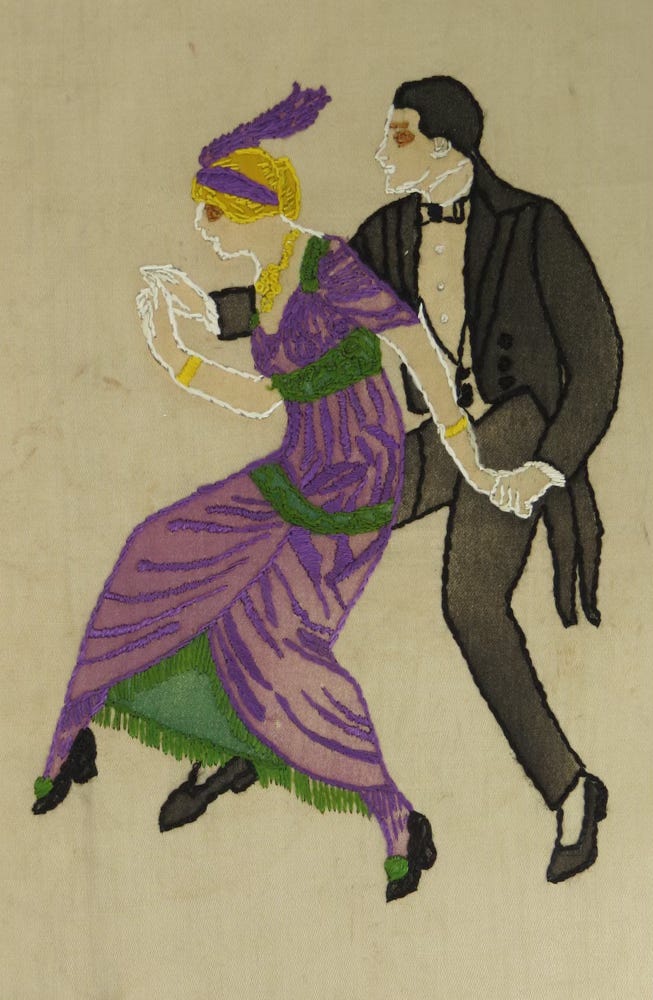 The couple is shown engaged in an energetic dance, knees up, leaping off the floor. Might this have been a fox trot, which the Library of Dance noted was introduced about 1913?