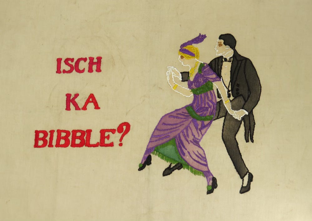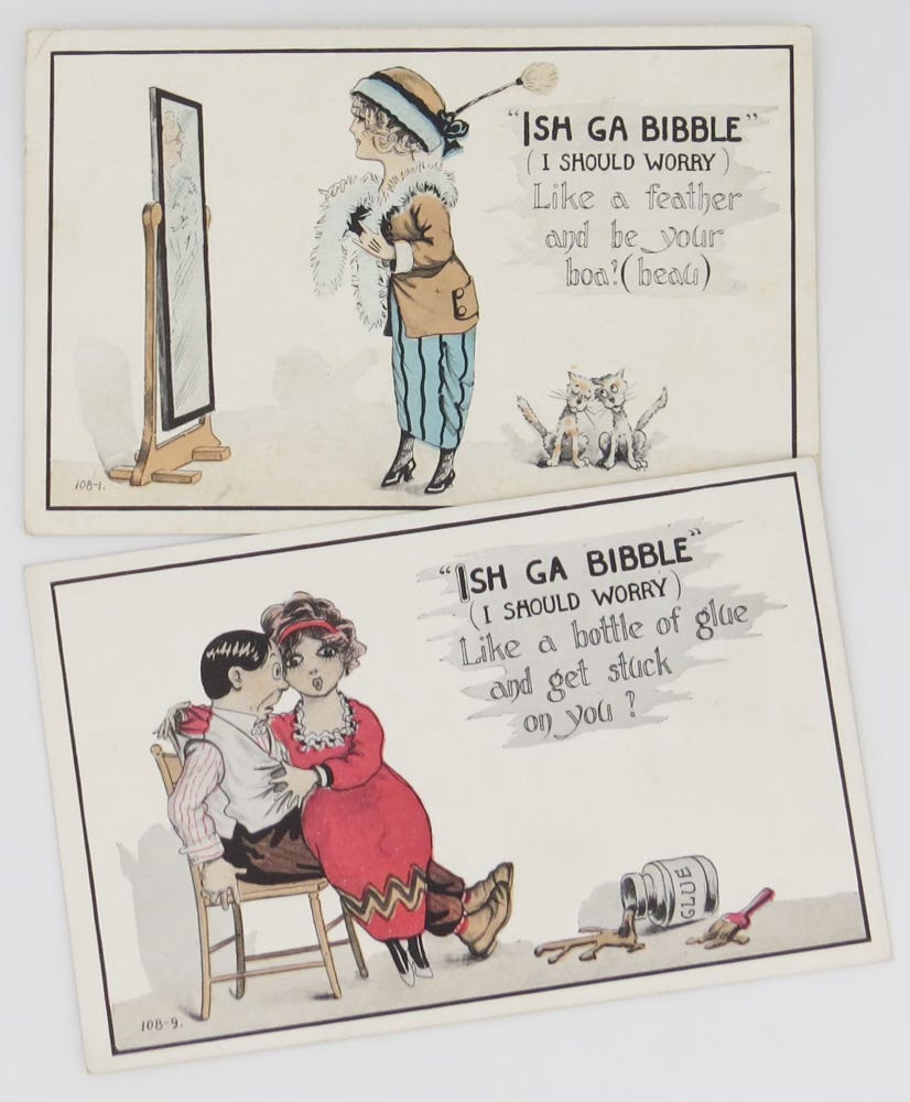 Then as now, there was much in the world to worry couples who merely wanted a fulfilling life with security, good company, music, and fun. While repeating a mantra of “Isch Ka Bibble” won’t solve real-world problems, its alliterative syllables are fun. Since we’re dusting off archaic words, let’s bring back this silly phrase.